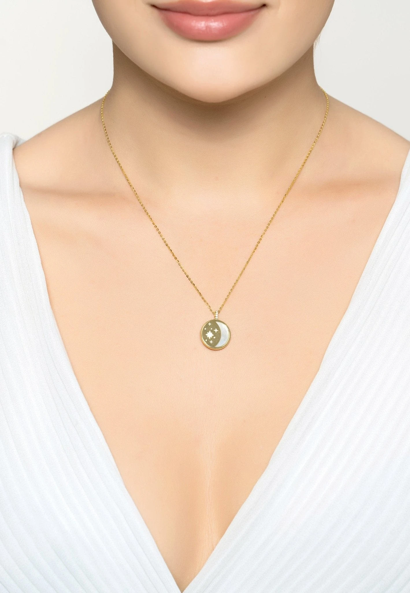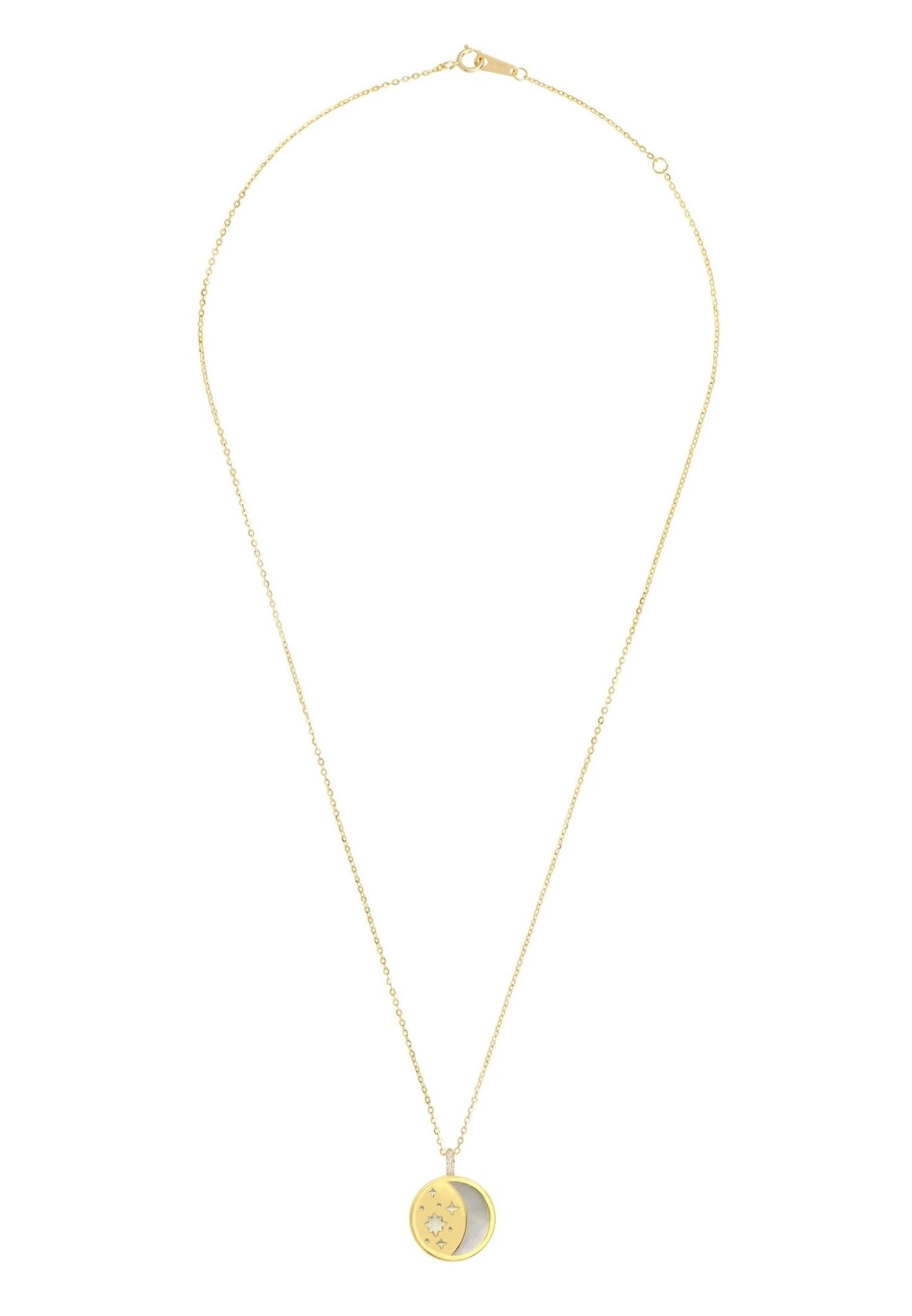 Introducing the beautiful and unique Star and Moon Mother Of Pearl Disc Necklace Gold! Handcrafted with 925 sterling silver and coated in 18ct gold, this necklace is sure to make a statement. The pendant features a stunning disc of mother of pearl, set within a gold setting and decorated with a small zircon adorned star at its centre. The reverse is equally as beautiful, consisting of cut-out patterns that evoke images of a crescent moon and stars. For an added touch of glamour, the bail is also covered in cubic zirconia.