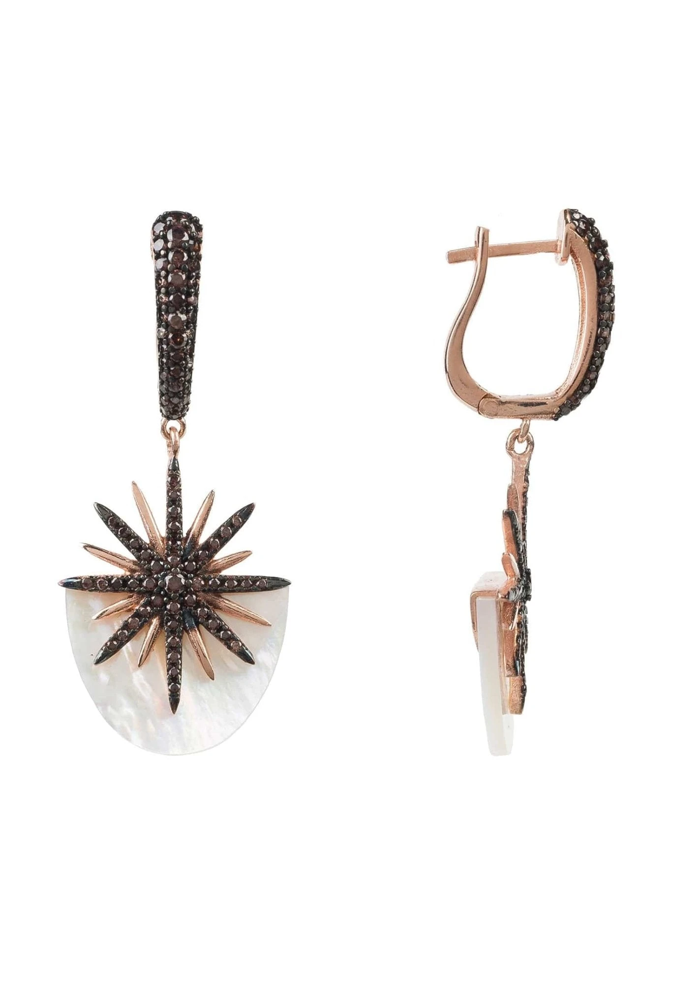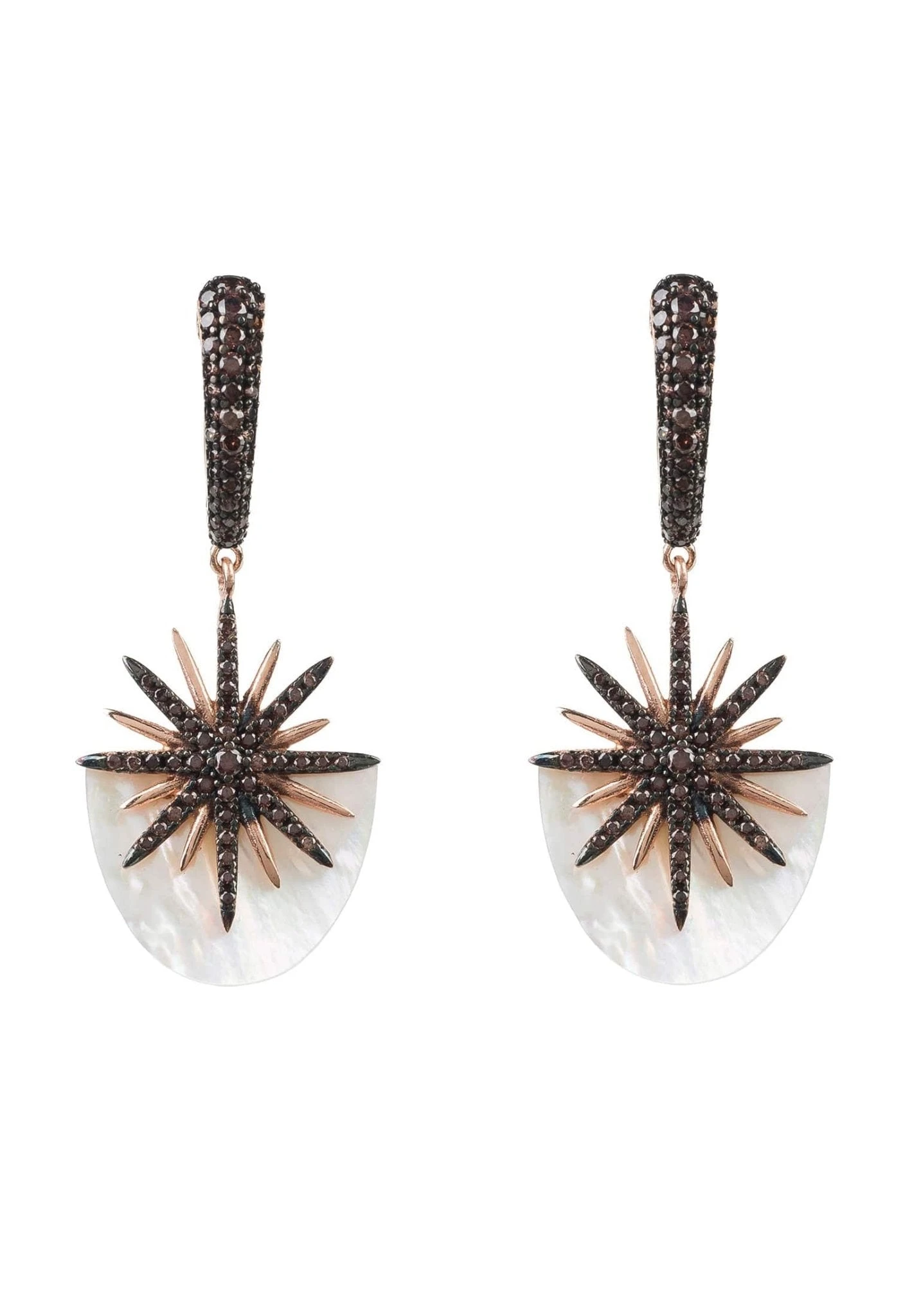 With a firework-like display of shimmering light, these Sunburst white mother of pearl earrings in Rosegold are truly stunning. The natural mother of pearl is crated in a half elliptical design and is set with Latelita’s signature chocolate zircon detailing, which sparkles from day to night. The iridescence of the mother of pearl subtly changes colour as it catches the light and reflects with a sparkle.