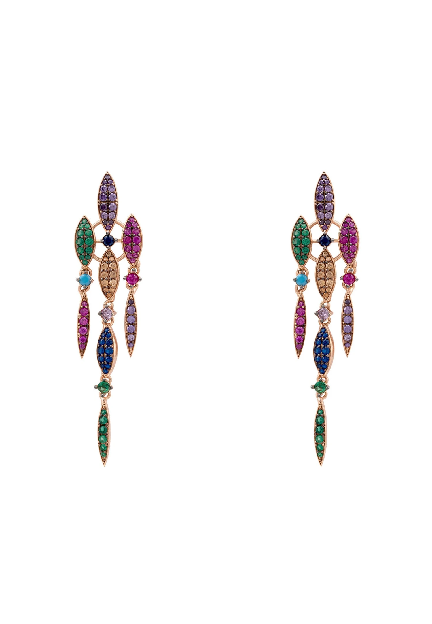 Made from 925 sterling silver dipped in 22ct rosegold, the Valencia statement drop earring dazzles with an abundance of multi-coloured sparkling zircons beautifully set within eight marquis shaped settings and single square cut zircons, all linked together in a triple strand drop design. The top four settings are fixed, while the others are linked by chain links, which gives the earrings a degree of flexibility for added sparkle as they move.