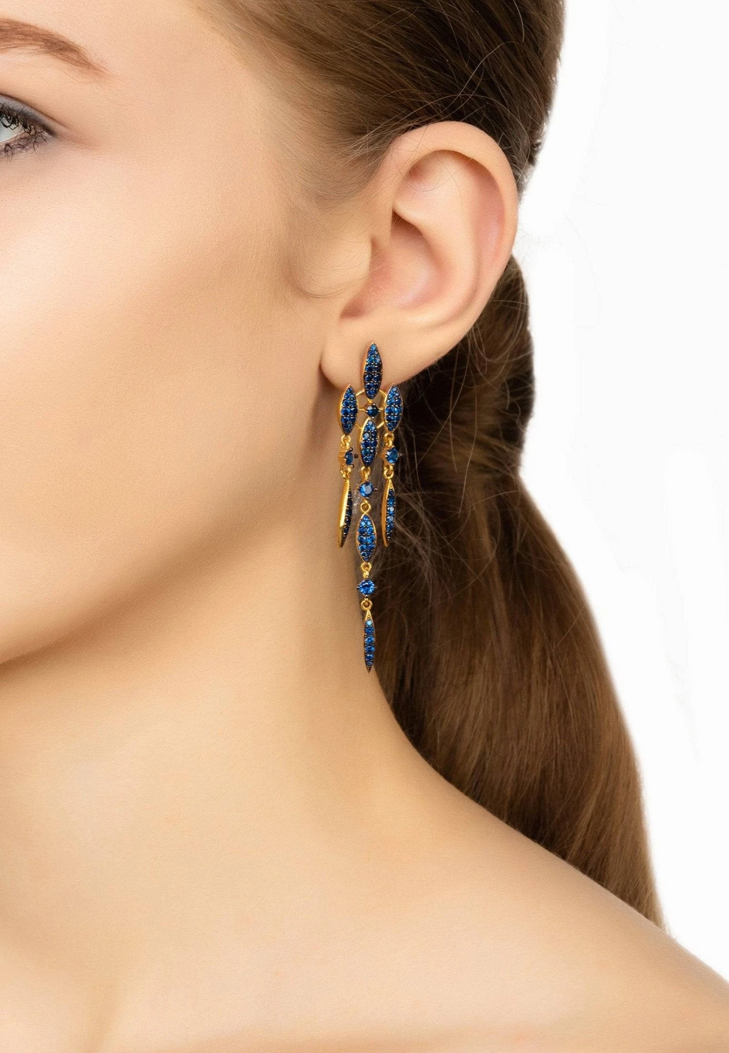 The Valencia statement drop earring, handcrafted in 925 sterling silver dipped in gold, dazzles with an abundance of sapphire blue sparkling zircons beautifully set within eight marquis shaped settings and single square cut zircons, all linked together in a triple strand drop design. The top four settings are fixed, while the others are linked by chain links, which gives the earrings a degree of flexibility for added sparkle as they move.