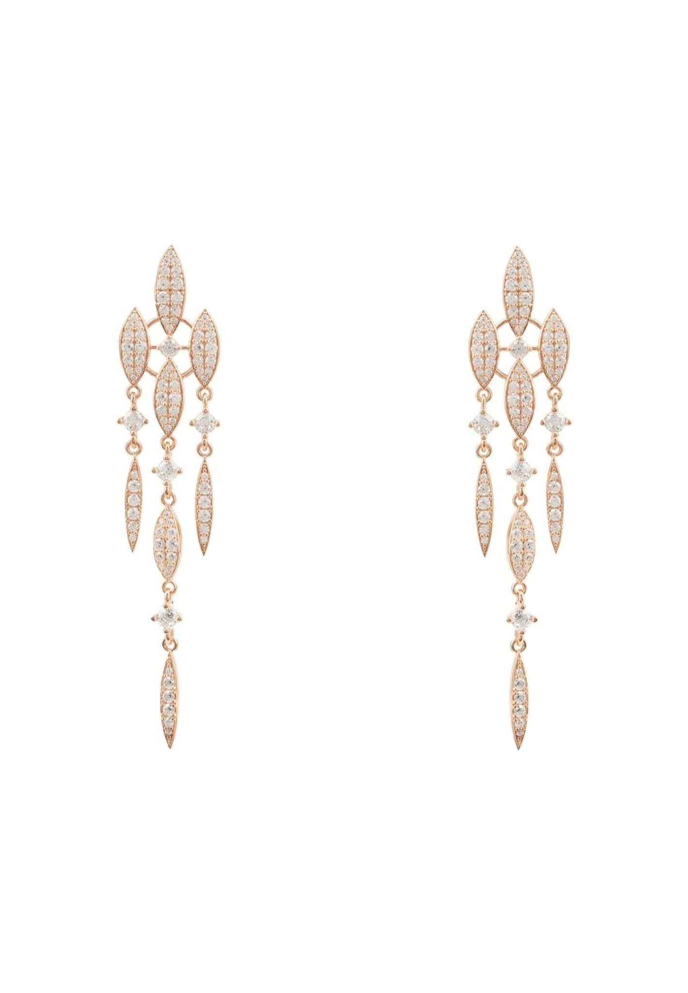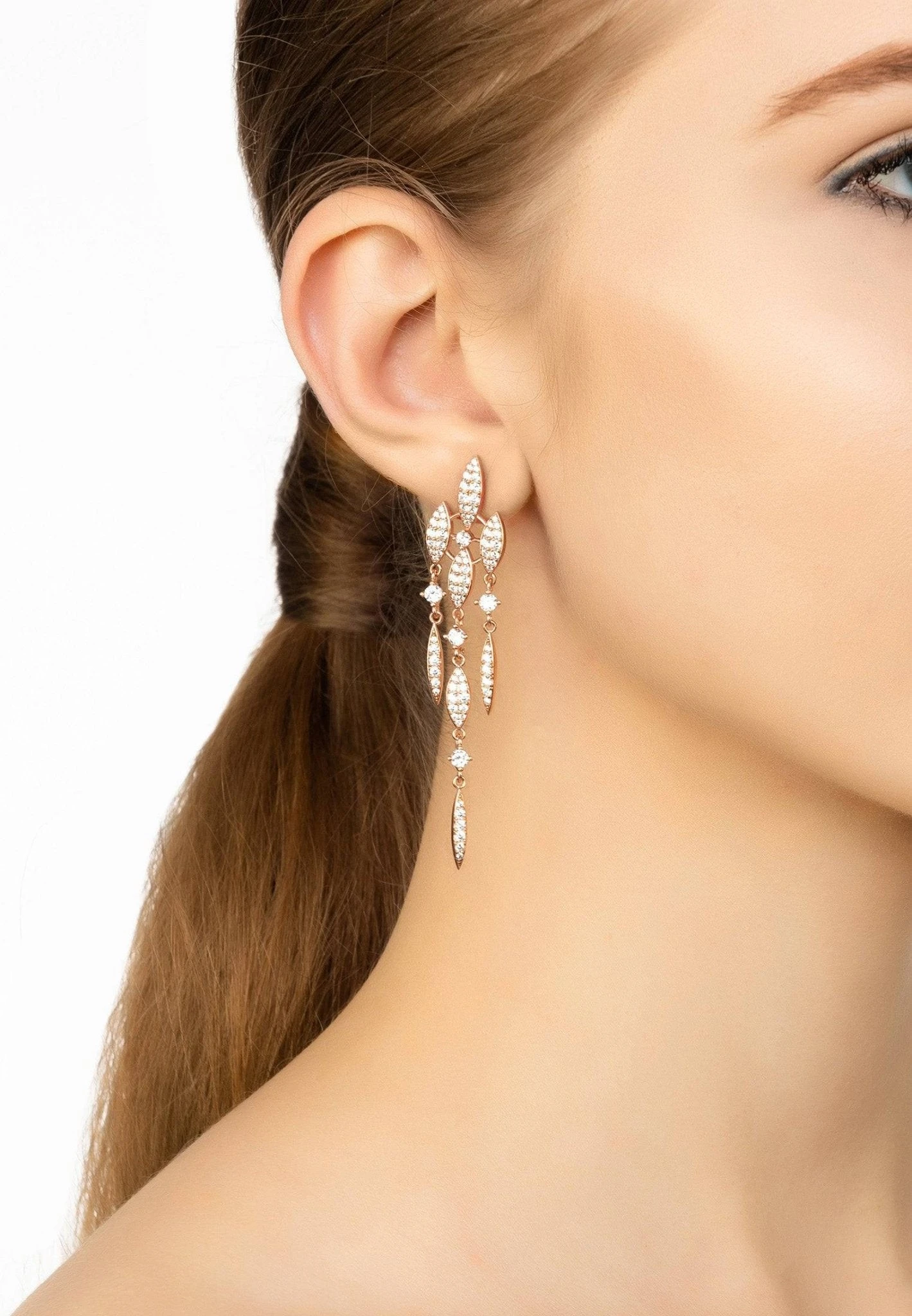 The Valencia statement drop earring, handcrafted in 925 sterling silver dipped in rosegold, dazzles with an abundance of white sparkling zircons beautifully set within eight marquis shaped settings and single square cut zircons, all linked together in a triple strand drop design. The top four settings are fixed, while the others are linked by chain links, which gives the earrings a degree of flexibility for added sparkle as they move.