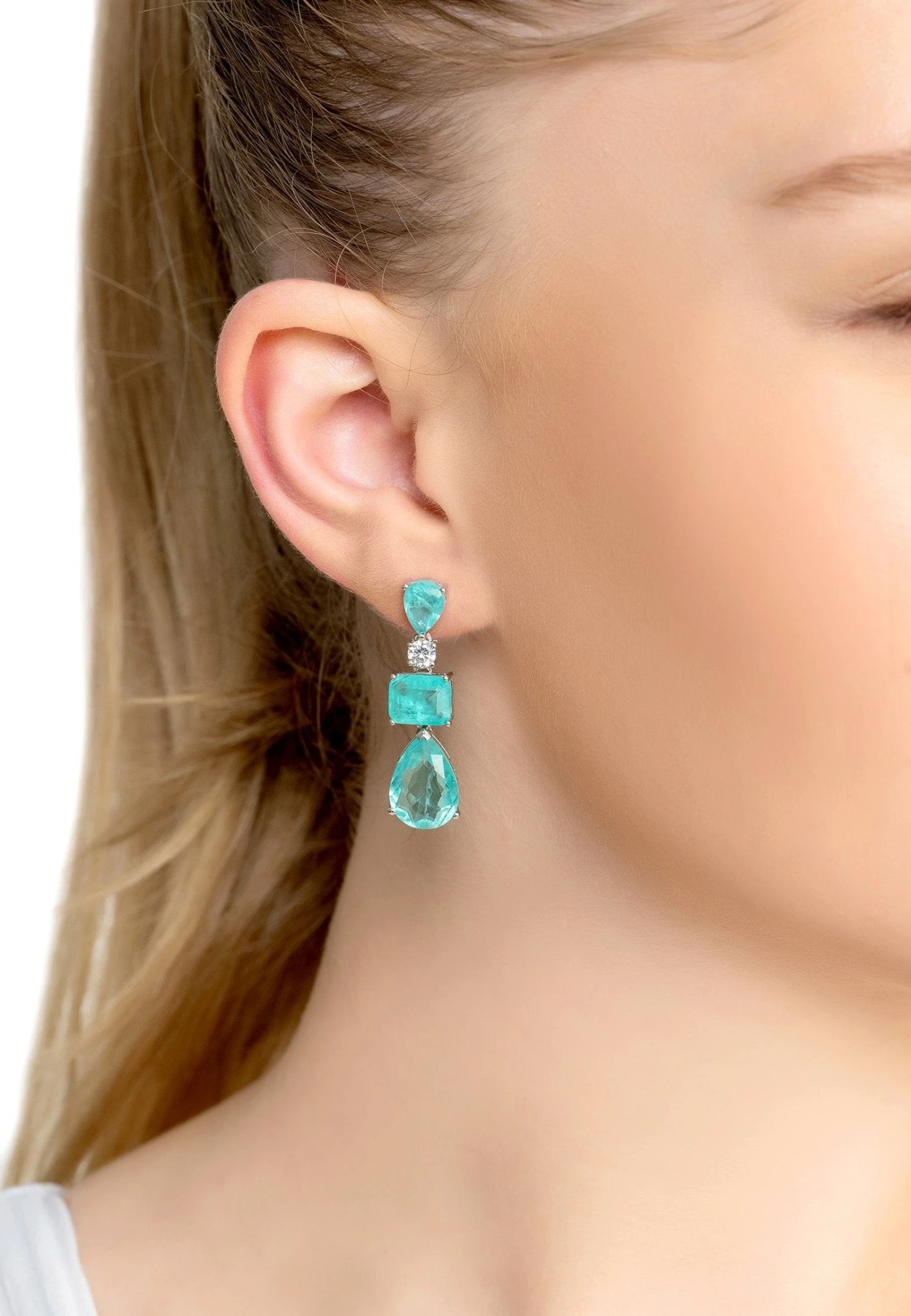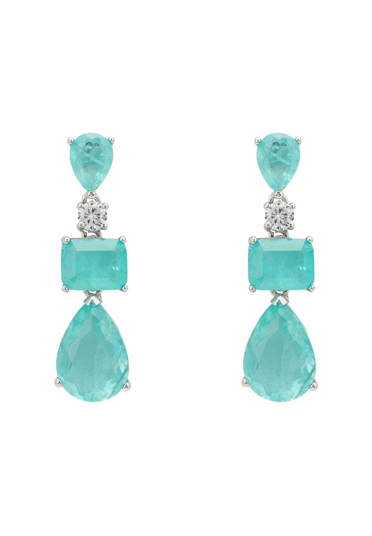 Introducing Valentina Drop Earrings Silver Paraiba Tourmaline! Looking for the perfect statement piece to make all your outfits shine? Look no further than these beautiful earrings. Crafted from 925 sterling silver, these classic and versatile pieces are perfect for any special occasion, whether it be a night out or a lunch with friends. Featuring lab-created Tourmalines. One rectangular and two tear-drop shaped, plus a round cut simulated diamond which separates the top two gemstones to provide the right amount of sparkle to amp up any look.