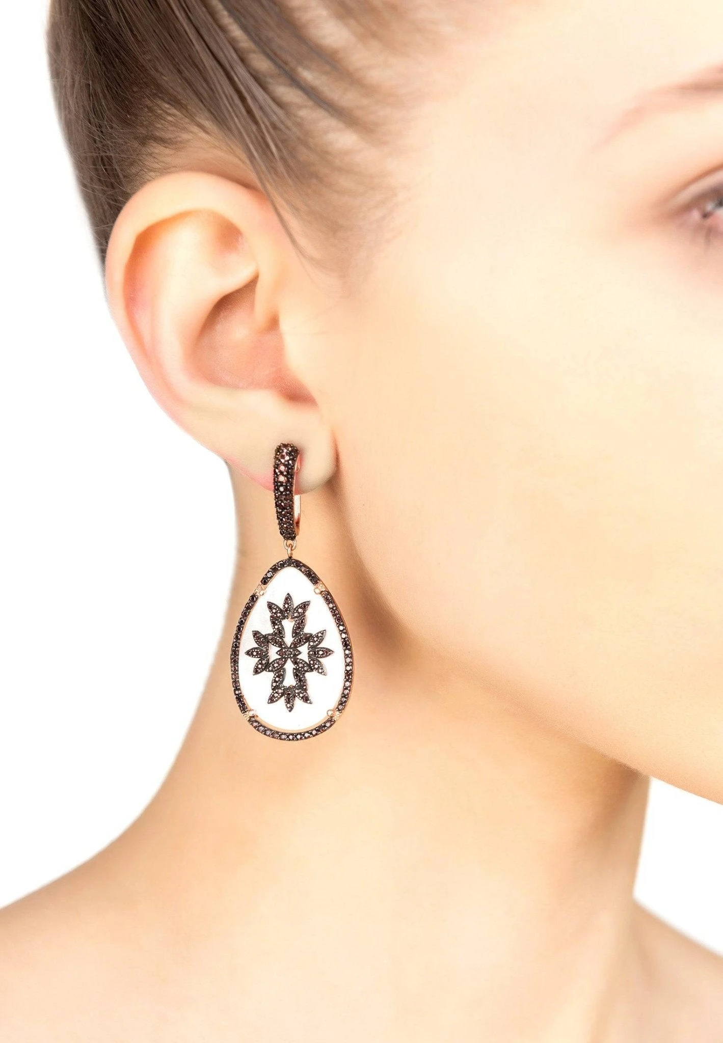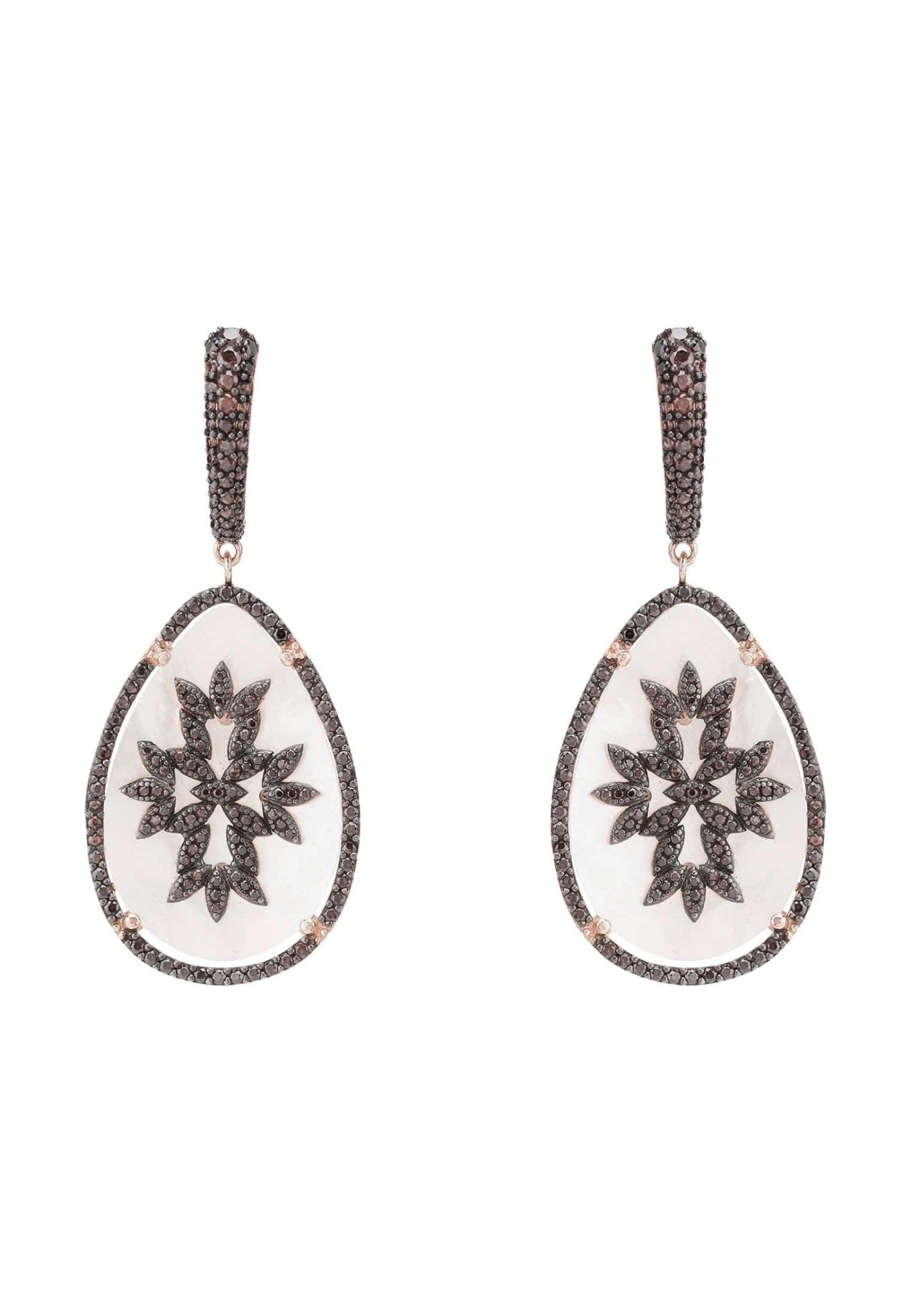 Elegant and chic this natural mother of pearl earring incorporates sparkling zircons around a teardrop shaped slice of mother of pearl with a central design of sparkling zircons, suspended from a creole top adorned with zircons.