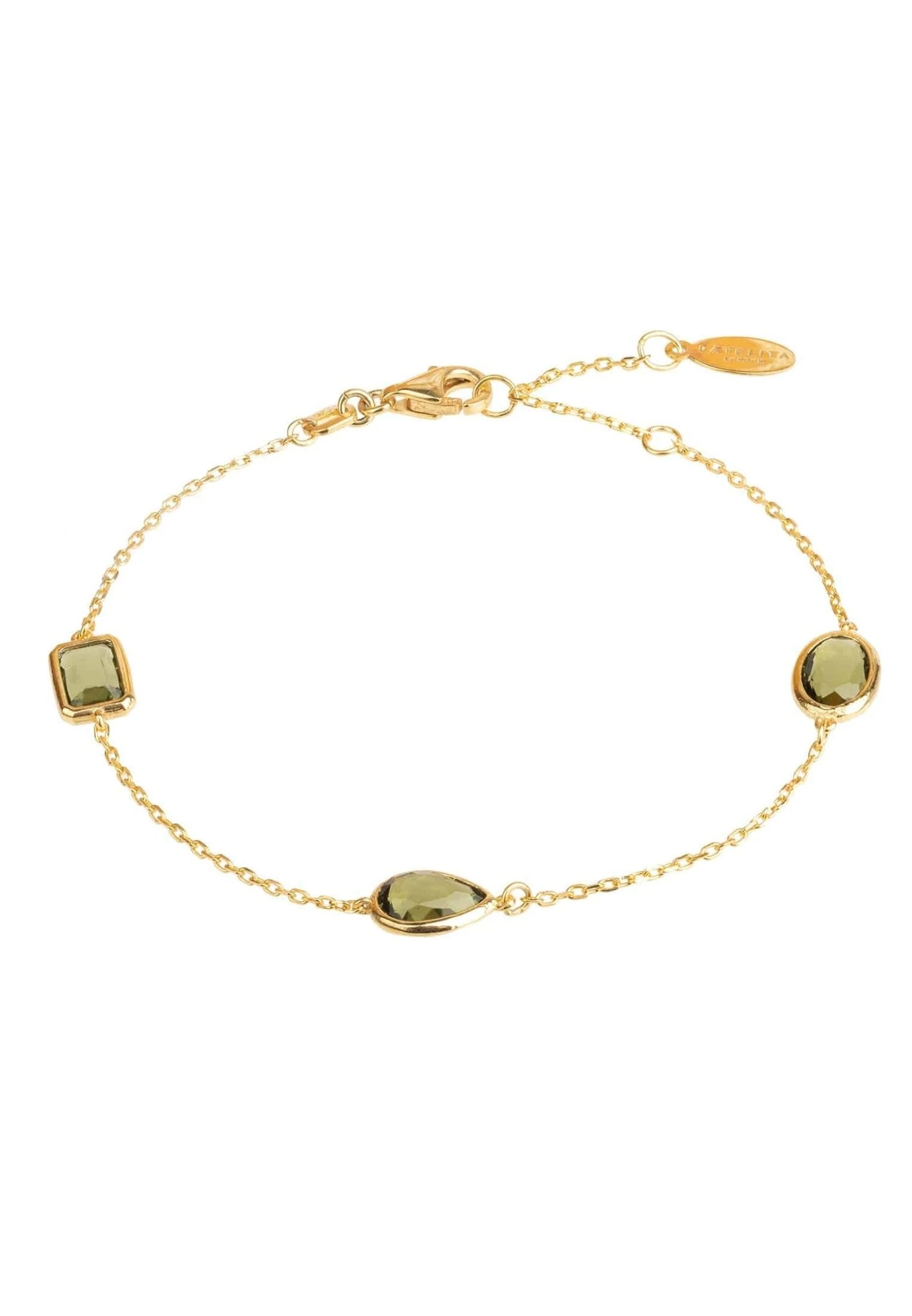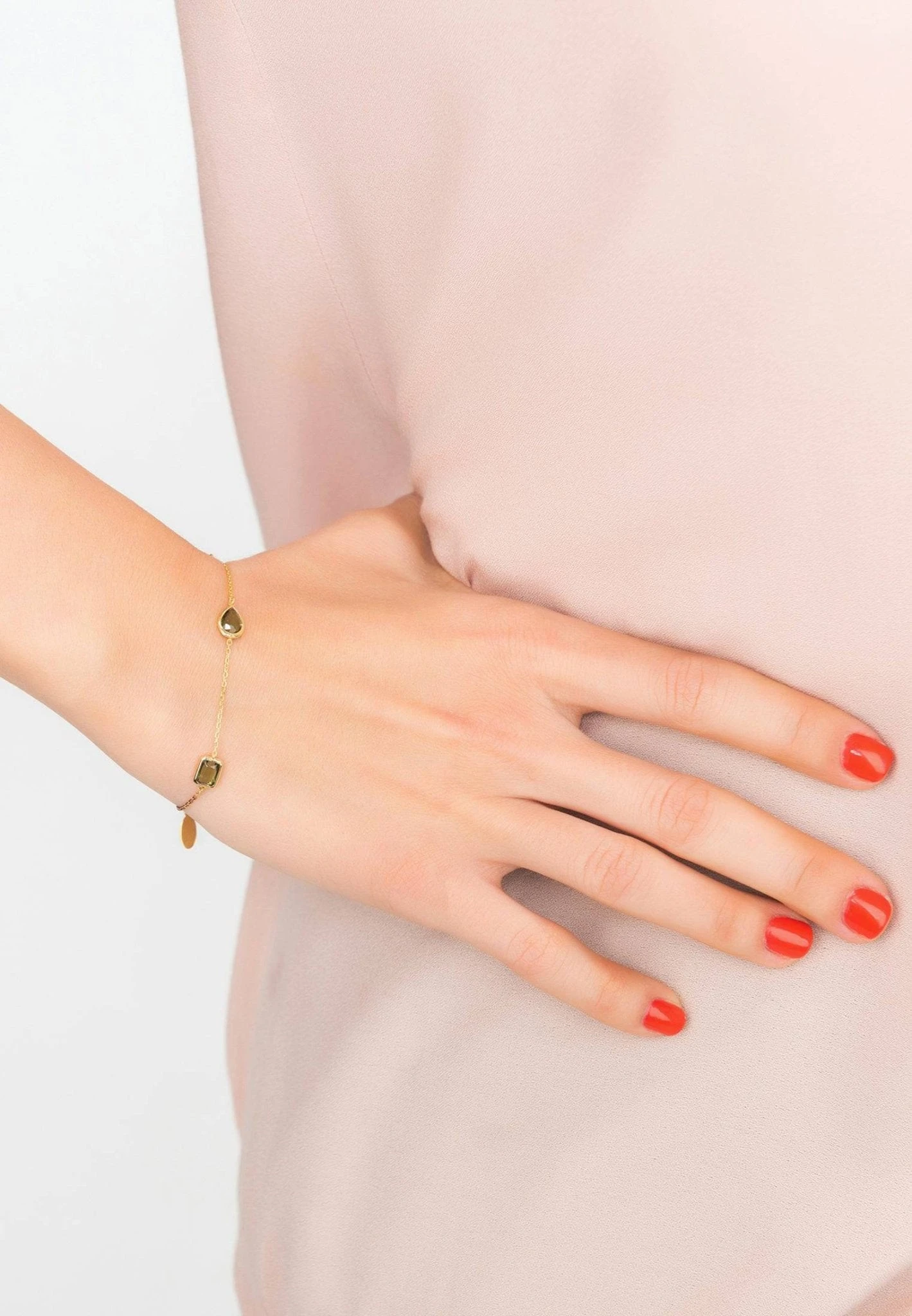 Let the Latelita Venice Bracelet Gold Peridot be the perfect addition to your jewellery collection. This delicate gemstone bracelet features a variety of cabochons in oval, rectangular, and teardrop shapes, spaced evenly along a fine chain. This bracelet looks chic with a pair of jeans and a blouse, or the finishing touch to an evening look.