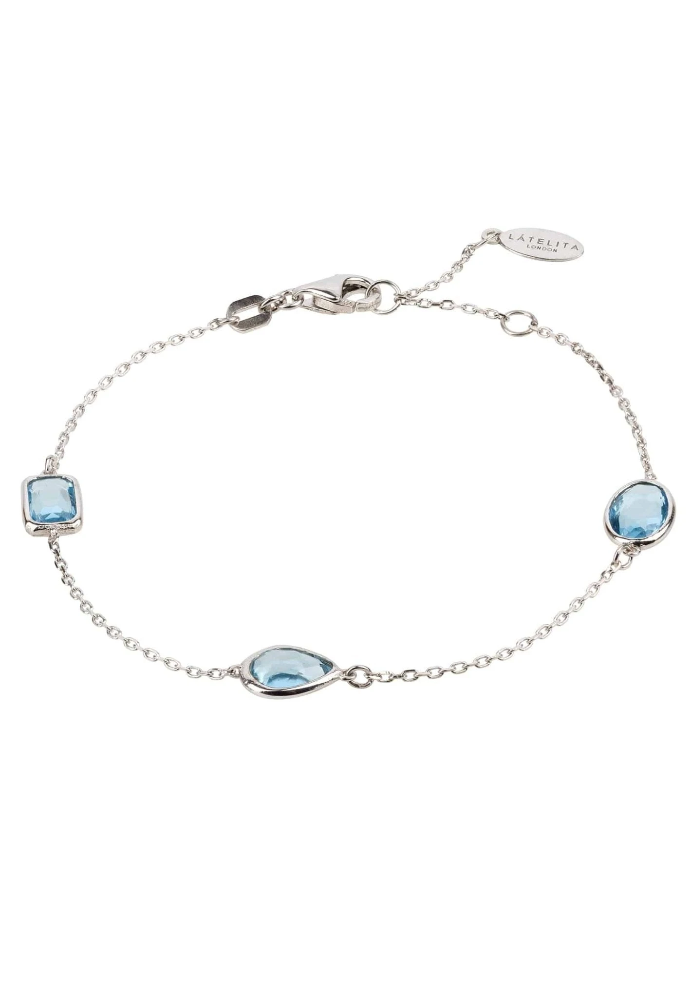 Let the Latelita Venice Bracelet in Silver Blue Topaz be the perfect addition to your jewellery collection. This delicate gemstone bracelet features a variety of cabochons in oval, rectangular, and teardrop shapes, spaced evenly along a fine chain. This bracelet looks chic with a pair of jeans and a blouse, or the finishing touch to an evening look.