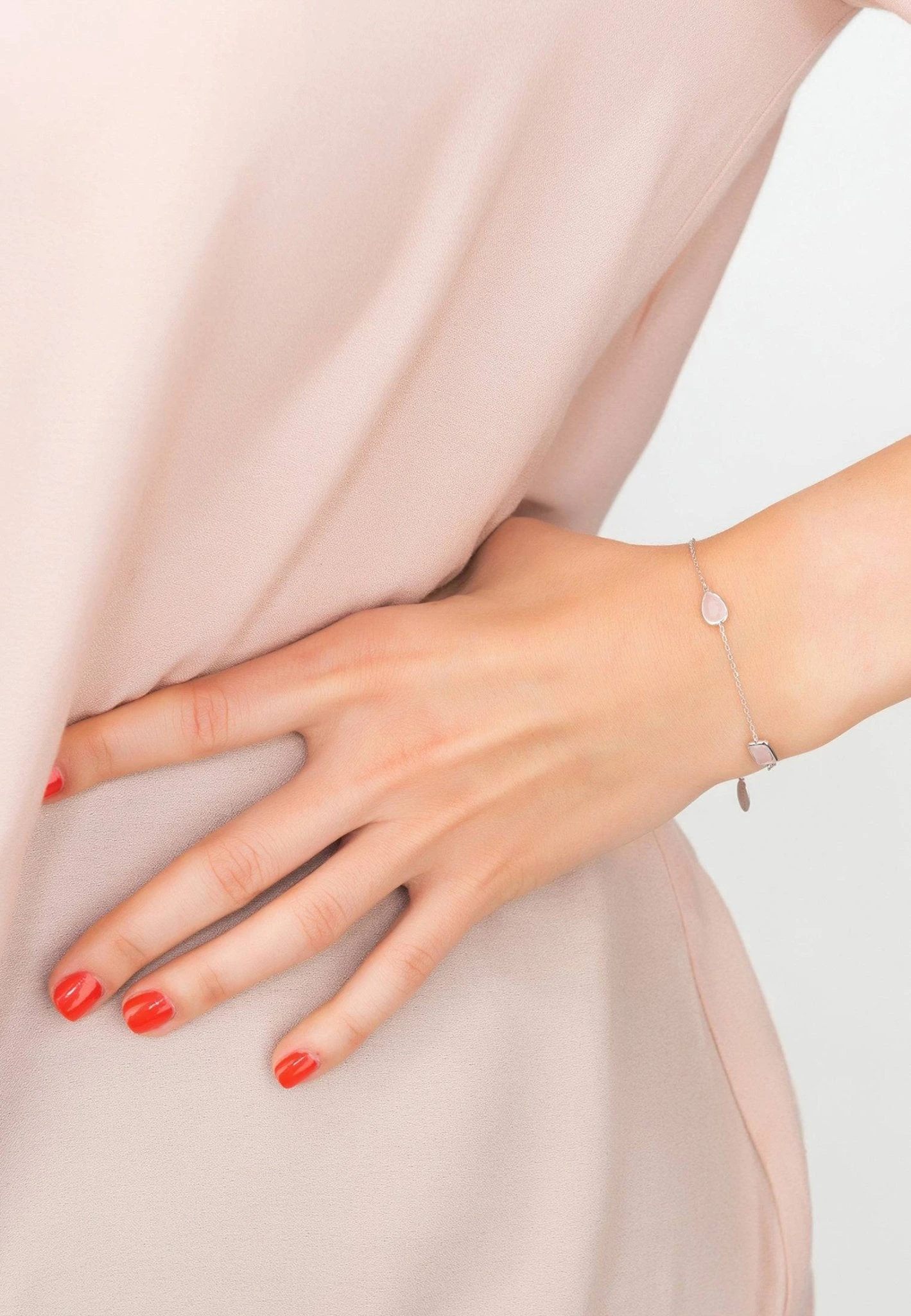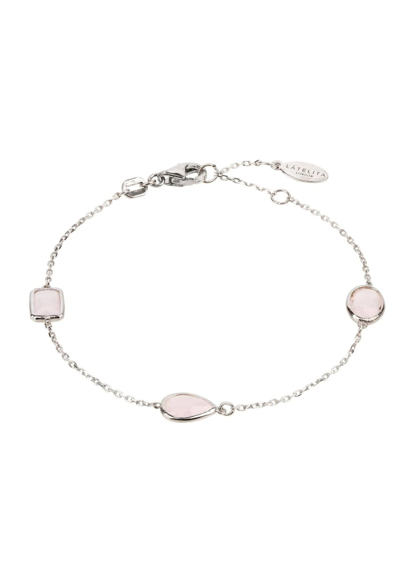 Let the Latelita Venice Bracelet in Silver Rose Quartz be the perfect addition to your jewellery collection. This chic gemstone bracelet features a variety of cabochons in oval, rectangular, and teardrop shapes, spaced evenly along a fine chain. This bracelet looks chic with a pair of jeans and a blouse, or the finishing touch to an evening look.