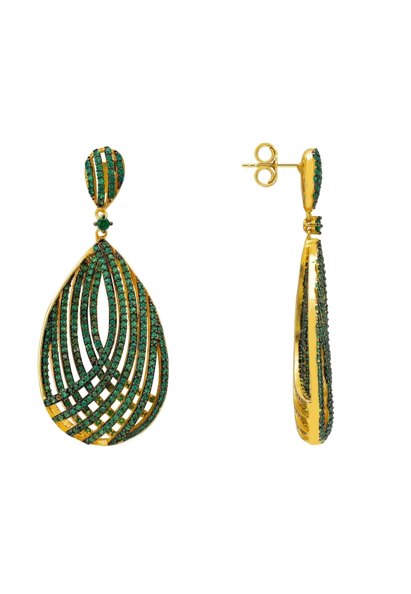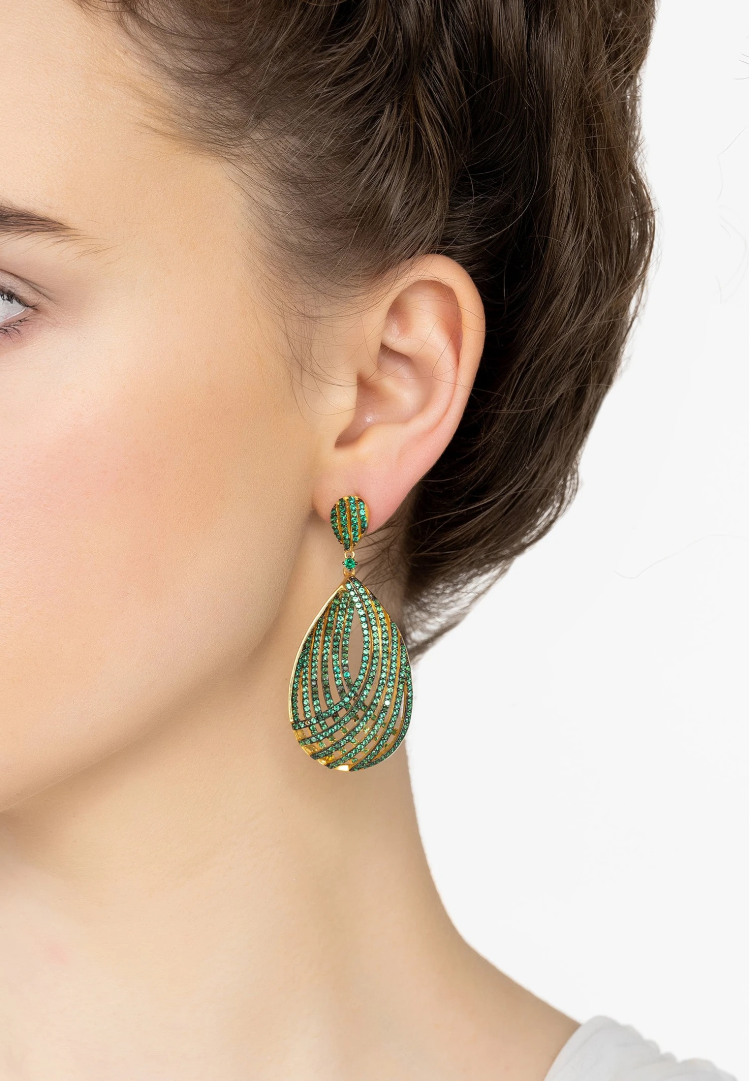 Get ready to be mesmerized by our Vortex Teardrop Earrings in Green Gold. Crafted from 925 silver and plated in luxurious 18-carat gold, these earrings are pure magic. The 3D teardrop shape showcases an open lattice design, peppered with twinkling zircons that’ll have you captivated.