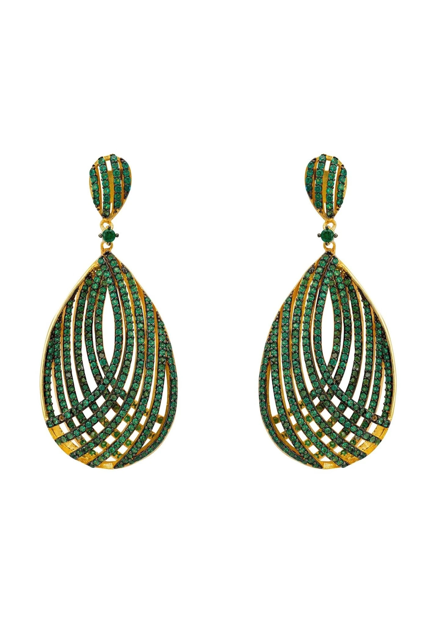 Adding to the hypnotic allure, each earring has a smaller teardrop shaped studded top, also glammed up with zircons. This design lets the earring sway naturally, capturing the light—and all the attention.